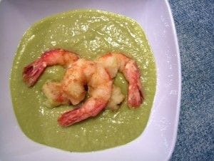 Cremina verde al cocco con piselli, zenzero e tempura di gamberoni