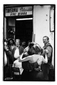La foto che vedete è stata scattata nel centro storico di Palermo dalla bravissima Lucia Baldini, ed è stata pubblicata nel suo libro Tangomalìa. Mi piace questa foto!! Mi piace lo sfondo della Taverna Pirtusiddo (in palermitano vuol dire Buchetto), mi piace lo sguardo che hanno gli uomini richiamati da questo tango improvvisato: tra lo stupore e la curiosità leggo nei loro occhi il desiderio di provare la passione che emanano i due ballerini… due ballerini che si abbracciano e fanno inziare una magia. Mi piace la mano delicata ed allo stesso ferma di lui, che guida una schiena libera dai capelli, appuntati in modo semplice. Mi piace la mano di lei, il suo tocco dolce ed appassionato, ed il suo totale abbandono all’abbraccio, un abbandono consapevole, mai servile…