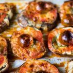 - Tira fuori la teglia e metti un cucchiaio di salsa su ogni fetta, aggiungi la mozzarella, una foglia di basilico, mezzo pomodorino e un ultimo giro d'olio su ogni pizzetta di melanzana.