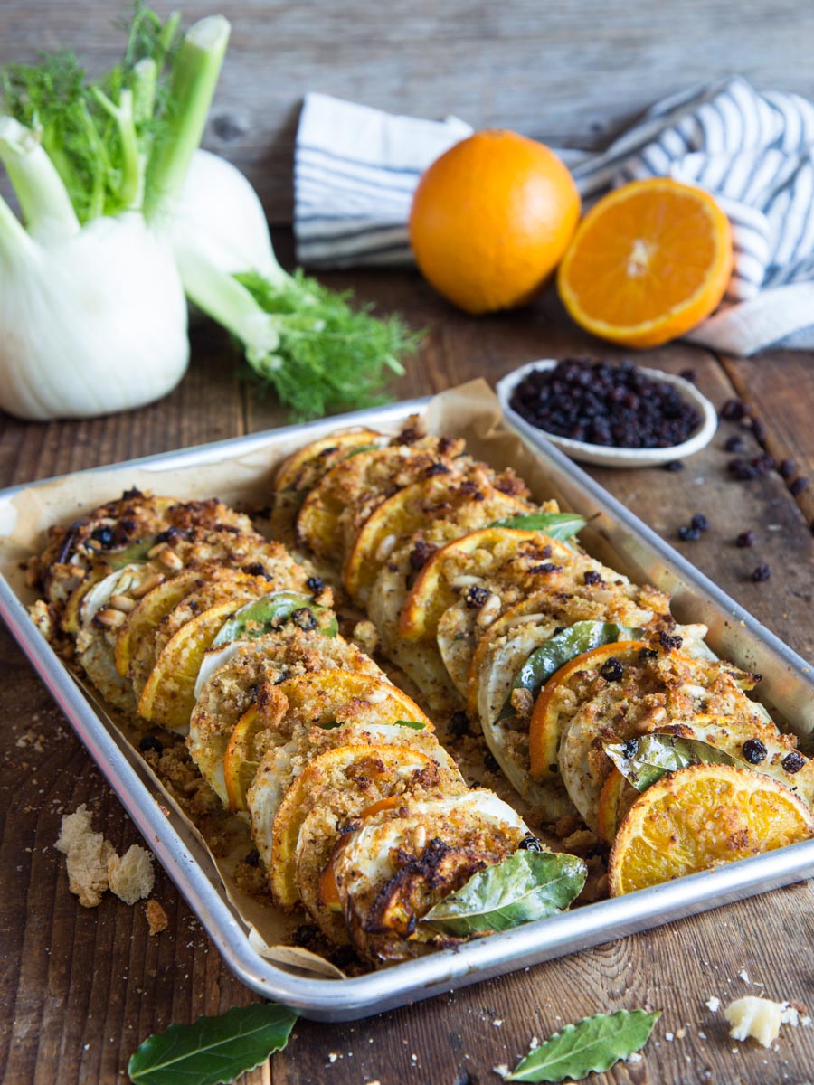 E oggi? Oggi i finocchi diventano protagonisti. In questa versione, il cuore della ricetta rimane intatto: c’è l’agrodolce che danza tra l’uvetta e il succo d’arancia, c’è la croccantezza data dalla panatura di pane raffermo, c’è il profumo dei pinoli tostati, dell’alloro e dell’olio buono. Ma al posto delle sarde troviamo delle fettine sottili di finocchio, che si fanno tenere e dorate al forno.