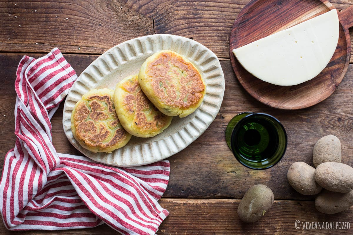 Con l’impasto di patate, fatto solo con patate lesse, amido di mais, sale e pepe, formo dei dischi, ci metto il ripieno al centro e richiudo, appiattendo leggermente.