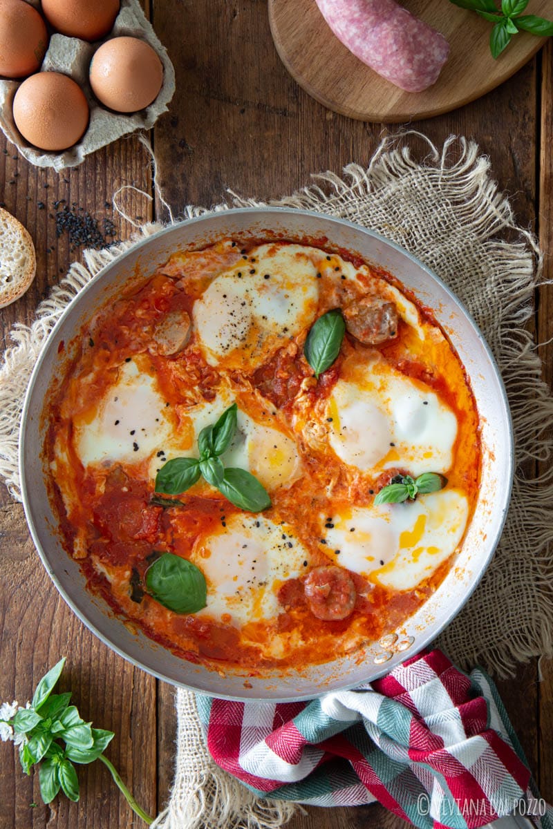 E la salsiccia, in questa versione, diventa protagonista silenziosa ma indispensabile, dà forza al pomodoro, accompagna le uova e profuma tutta la cucina.