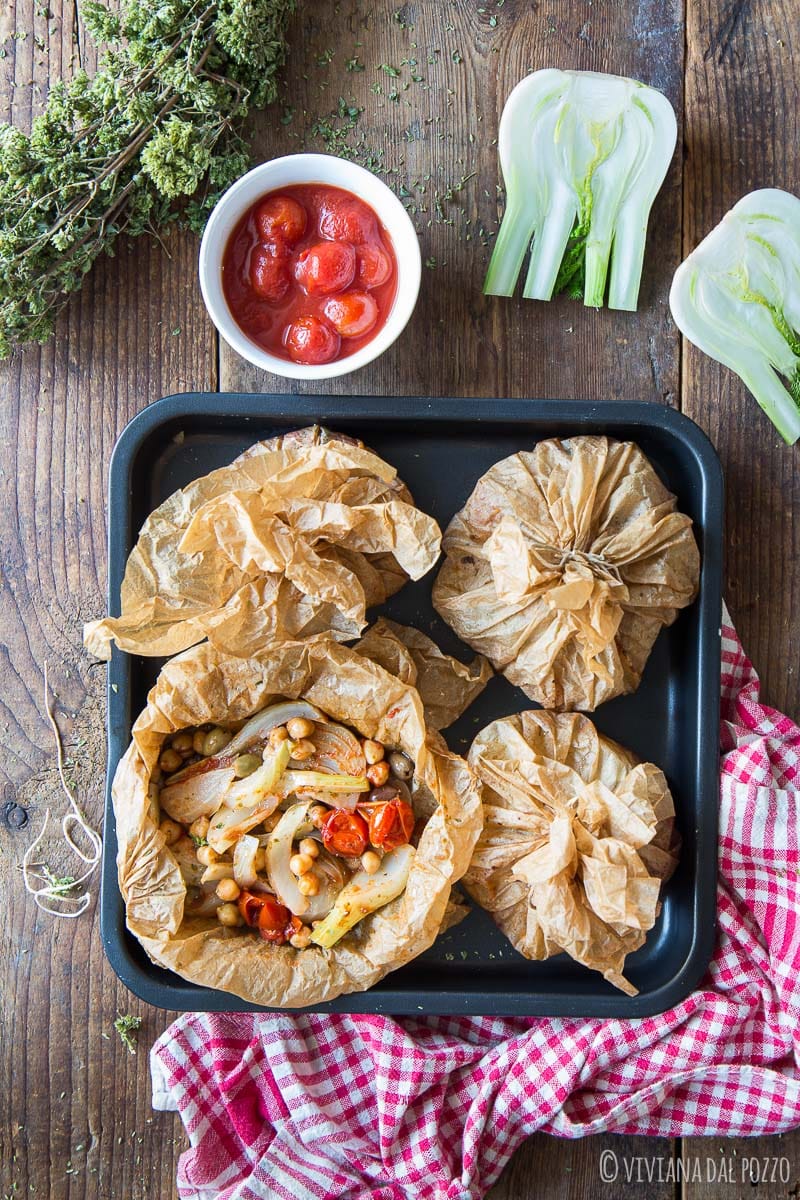 Basta appoggiarli su un vassoio e portarli in tavola ancora chiusi, lasciando che siano gli ospiti ad aprirli e a lasciarsi avvolgere dal profumo di origano e aglio arrostito.