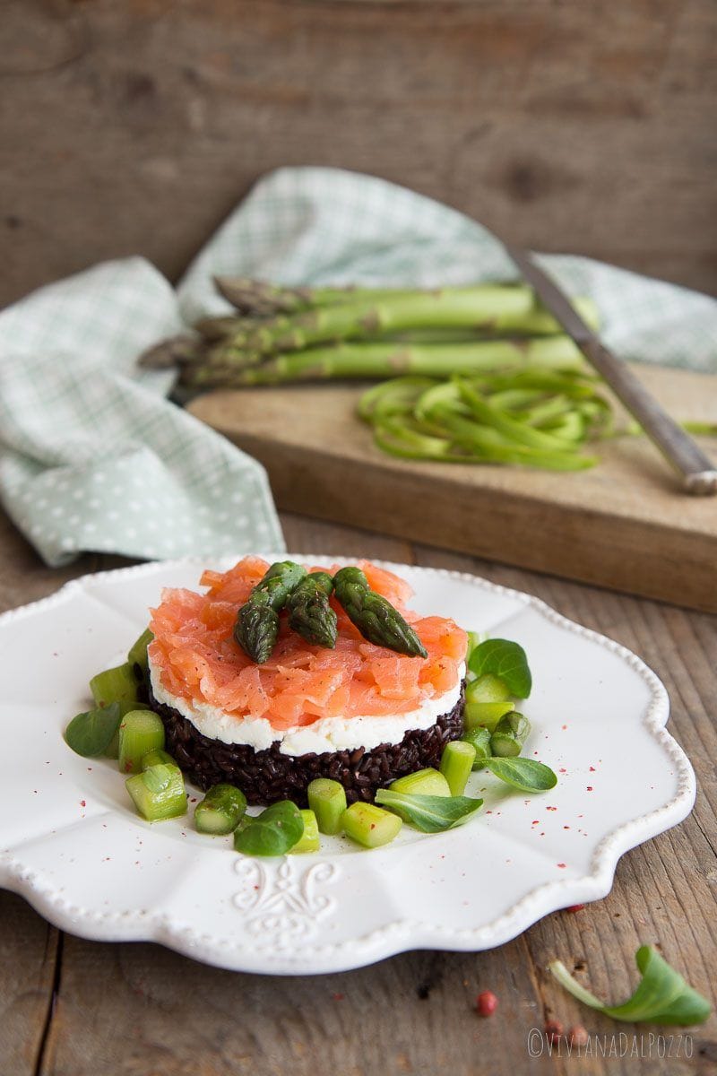 4. Tartare di riso nero e salmone con robiola e asparagi