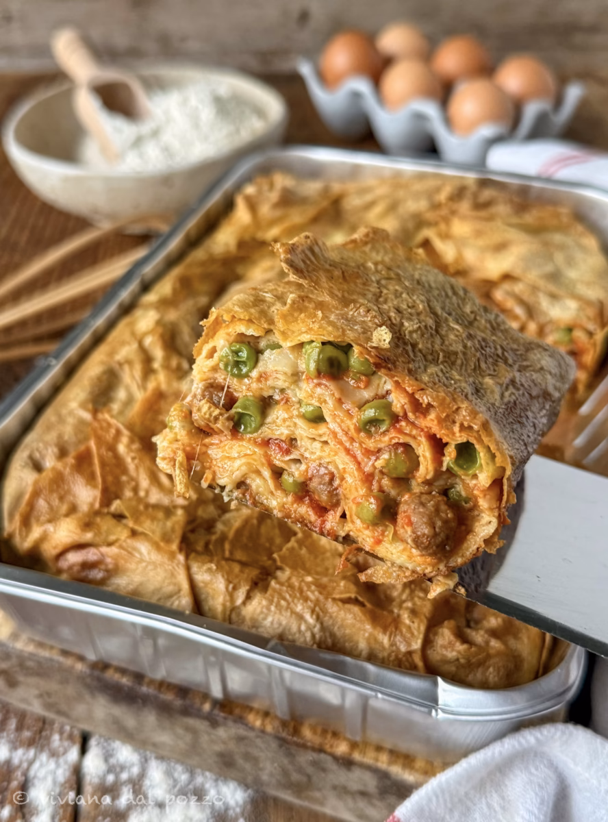 Il timballo teramano non si racconta partendo dal risultato finale, si capisce osservando come prende forma. È una costruzione paziente, una ricetta tipica della tradizione abruzzese, fatta di strati sottilissimi che si susseguono uno dopo l’altro, senza fretta.